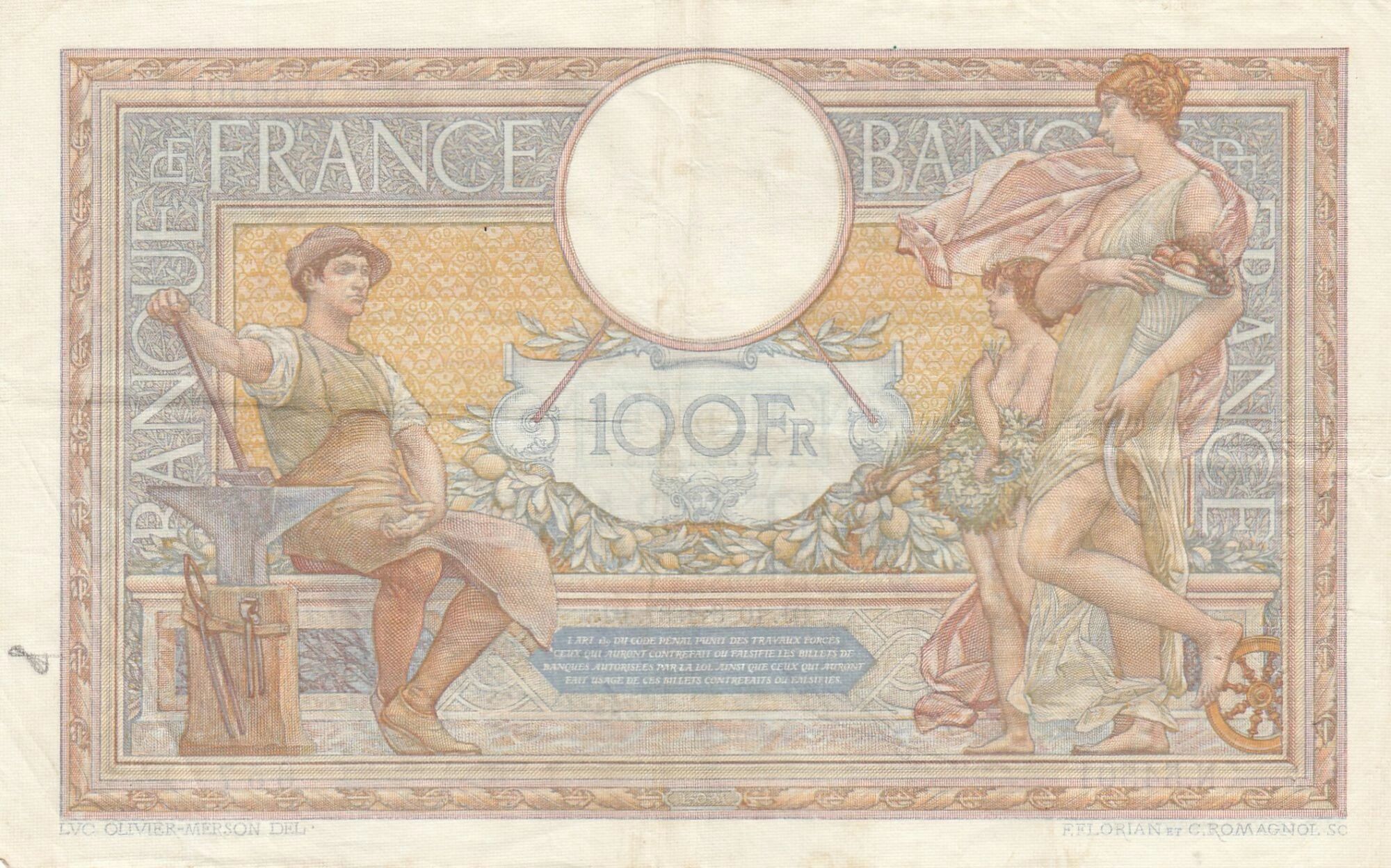 The banknote is identifiable as being of the "Luc Olivier Merson" type. The 100 Francs Luc Olivier Merson banknote is a French banknote issued during a specific period of French monetary history. It takes its name from the personality depicted on the banknote, Luc Olivier Merson, a renowned French painter.