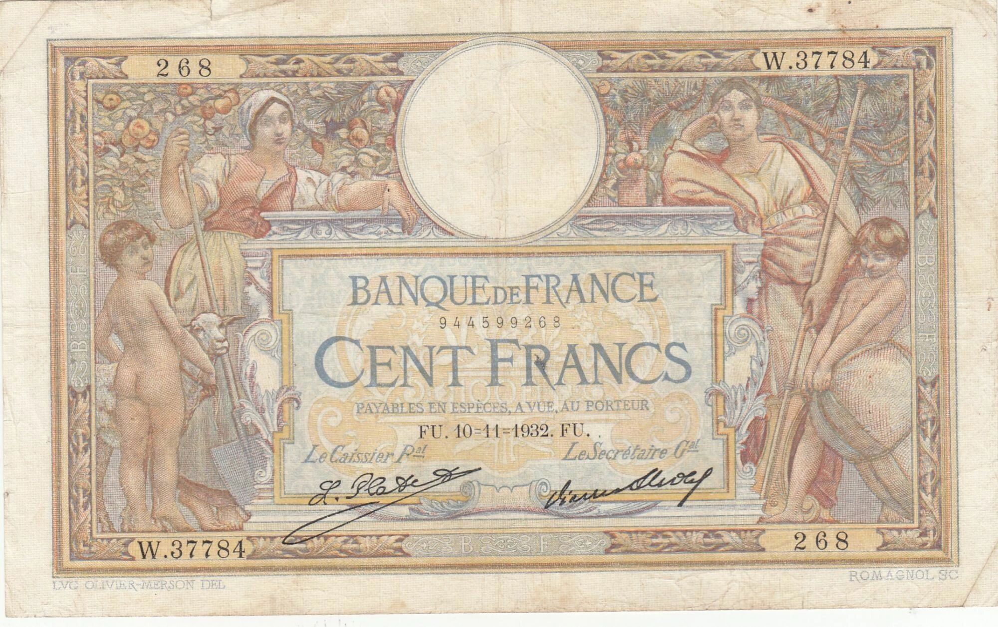 This banknote is a French 100 Francs, issued on November 10, 1932. It is part of a series identified by the code "W.37784". The banknote features Luc Olivier Merson.