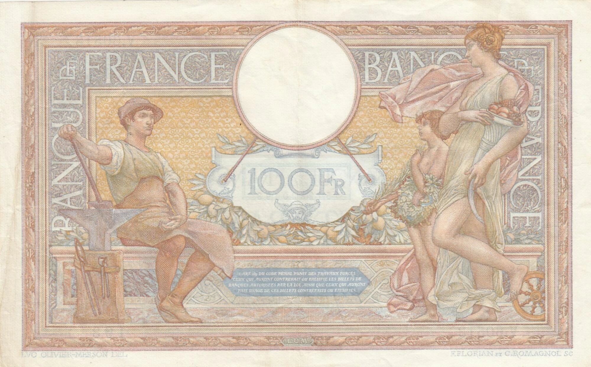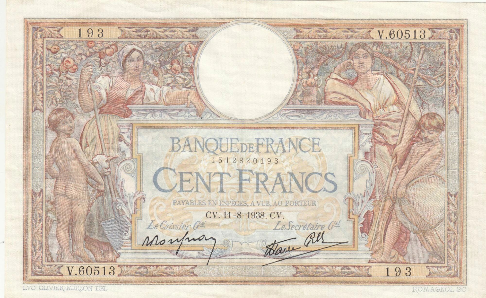 This banknote is an issue of the Banque de France, with a nominal value of 100 francs.