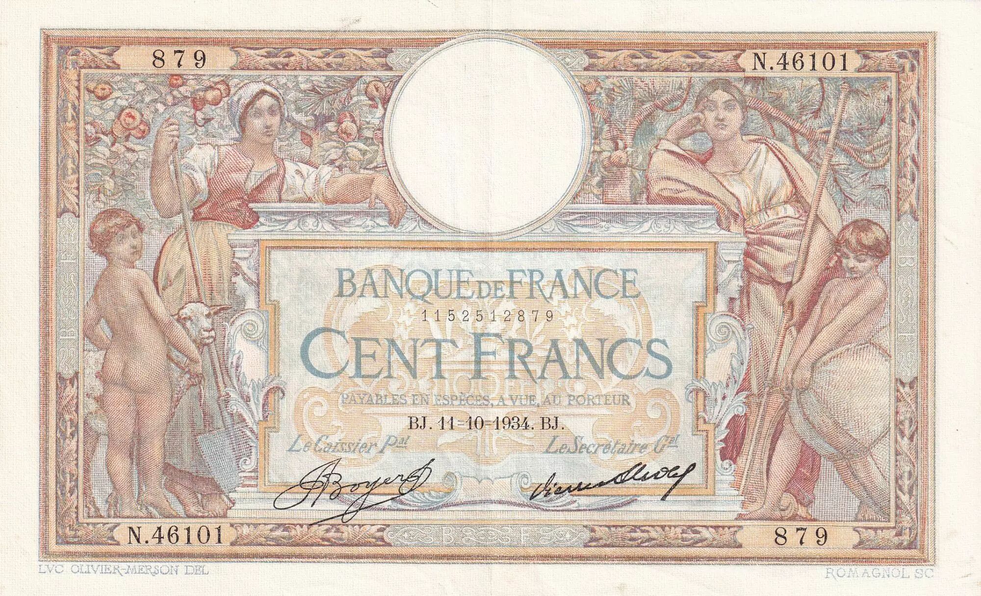 Home > French Banknotes > Bank of France Banknotes > 100 Francs Banknotes > Luc Olivier Merson Type 1906 (1908-1939) > France 100 Francs - Luc Olivier Merson - 11-10-1934 - Serial N.46101 - F.24.13