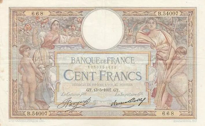 Banknote France 100 Francs Luc Olivier Merson - 13-05-1937 - Serial B.54007