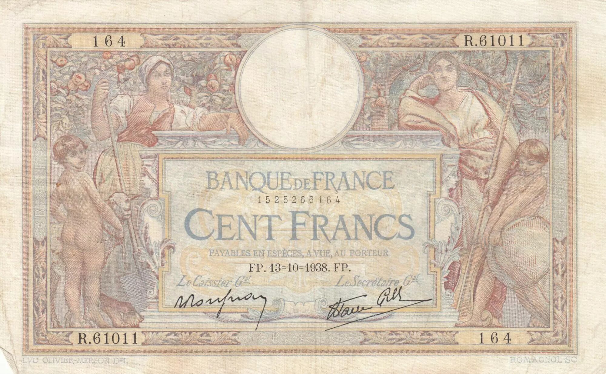 Banknote France 100 Francs - Luc Olivier Merson - 13-10-1938 - Serial R.61011