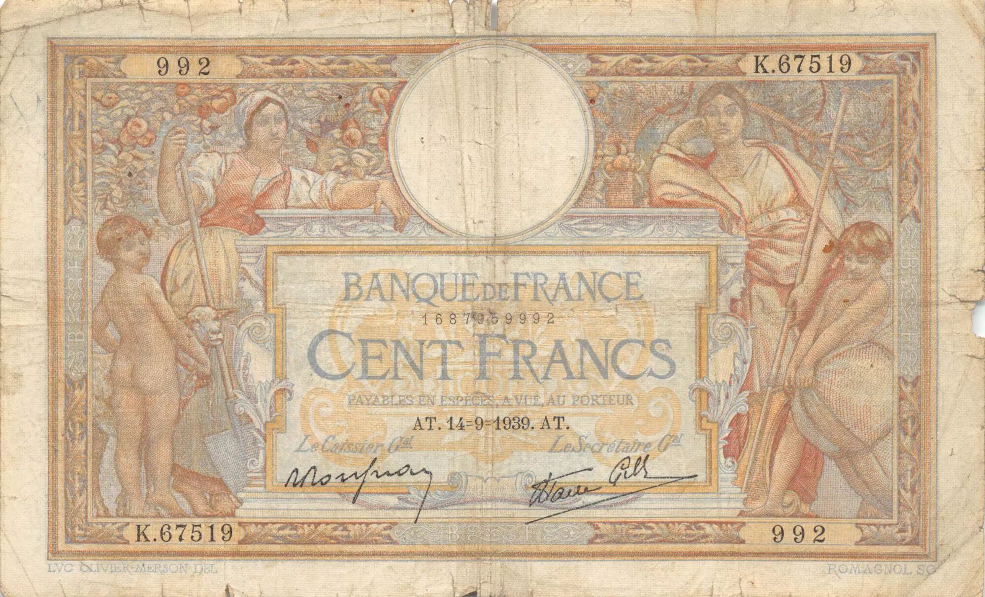 Billet France 100 Francs Luc Olivier Merson - 14-09-1939 Série K.67519 - TB
