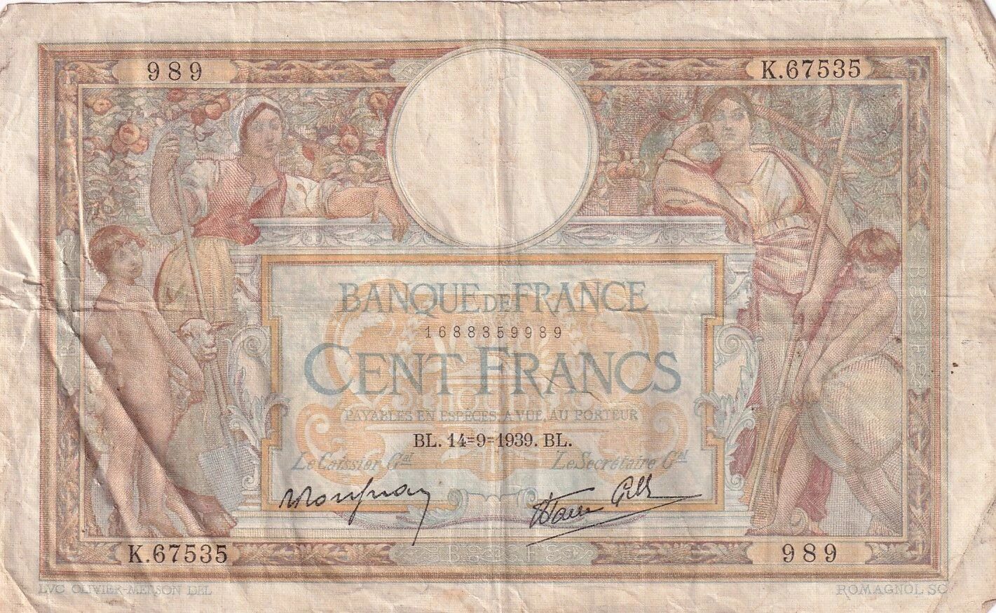 Ce billet de banque français, d'une valeur nominale de 100 francs, a été émis le 14 septembre 1939. Il appartient à la série K.67535.