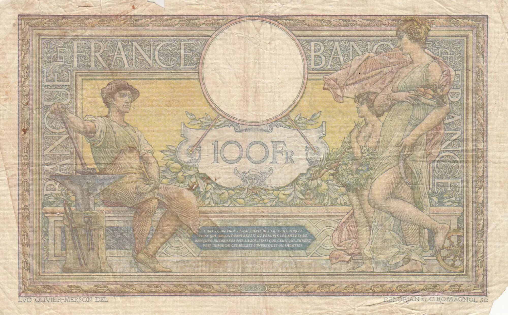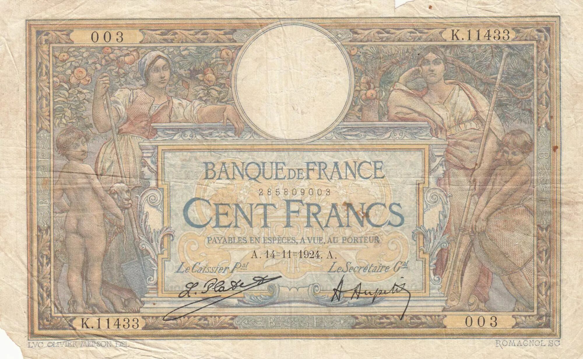 Accueil > Archivage > archivage-Billets Français > France 100 Francs - Luc Olivier Merson - 14-11-1924 - Série K.11433