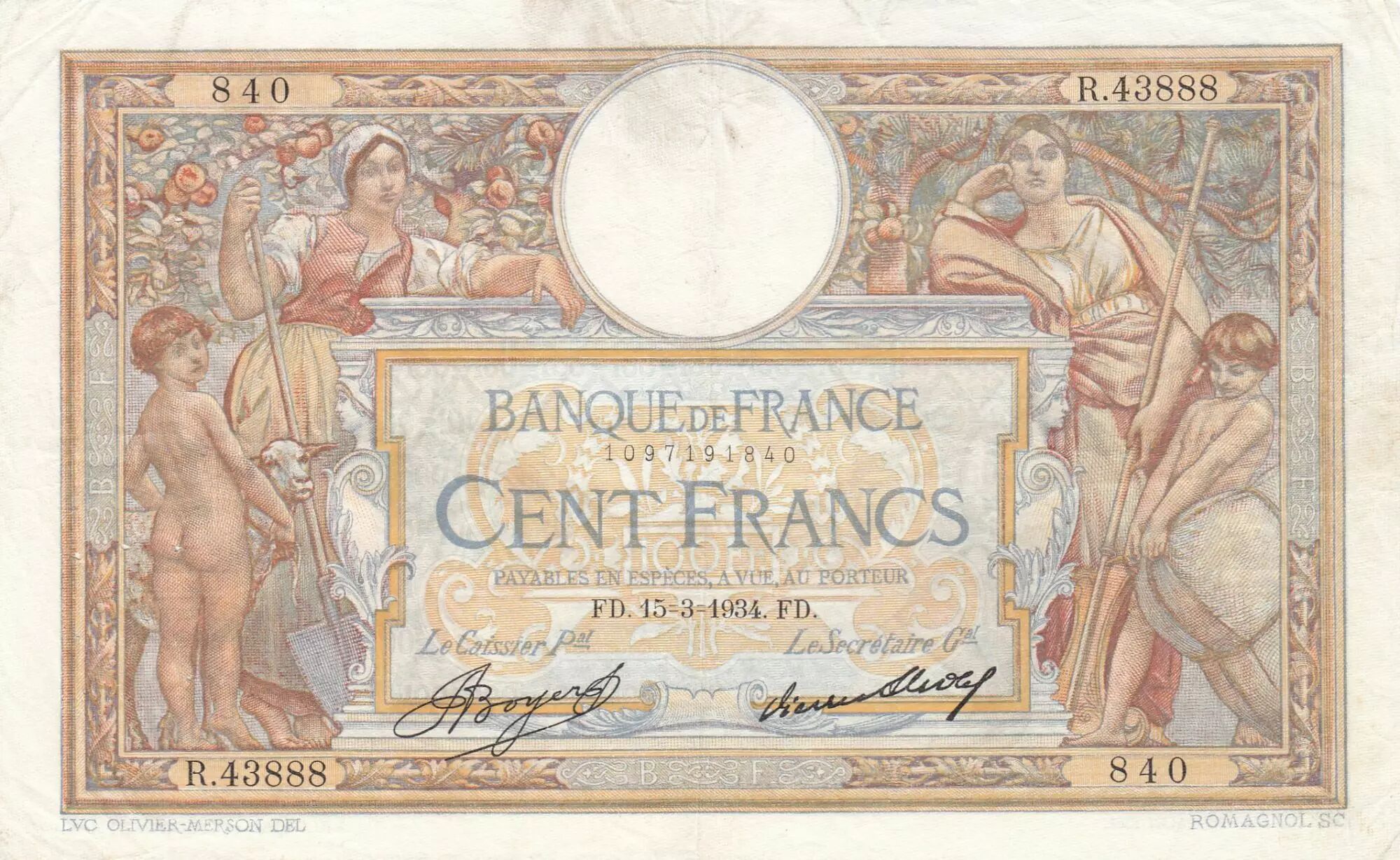 Accueil > Archivage > archivage-Billets Français > France 100 Francs - Luc Olivier Merson - 15-03-1934 - Série R.43888