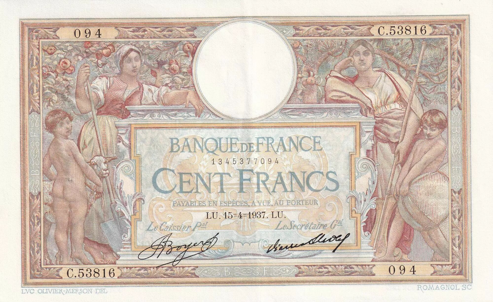 Home > French Banknotes > Bank of France Banknotes > 100 Francs Banknotes > Luc Olivier Merson Type 1906 (1908-1939) > France 100 Francs - Luc Olivier Merson - 15-04-1937 - Serial C.53816 - P.69