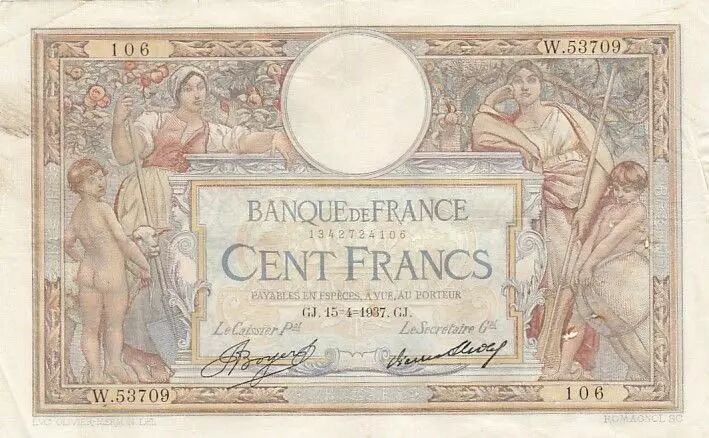Banknote France 100 francs - Luc Olivier Merson - 15-04-1937 - Serial W.53709