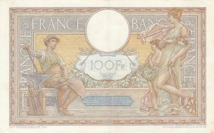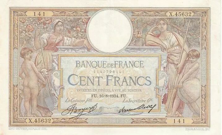 Banknote France 100 Francs Luc Olivier Merson - 16-08-1934- Serial X.45632