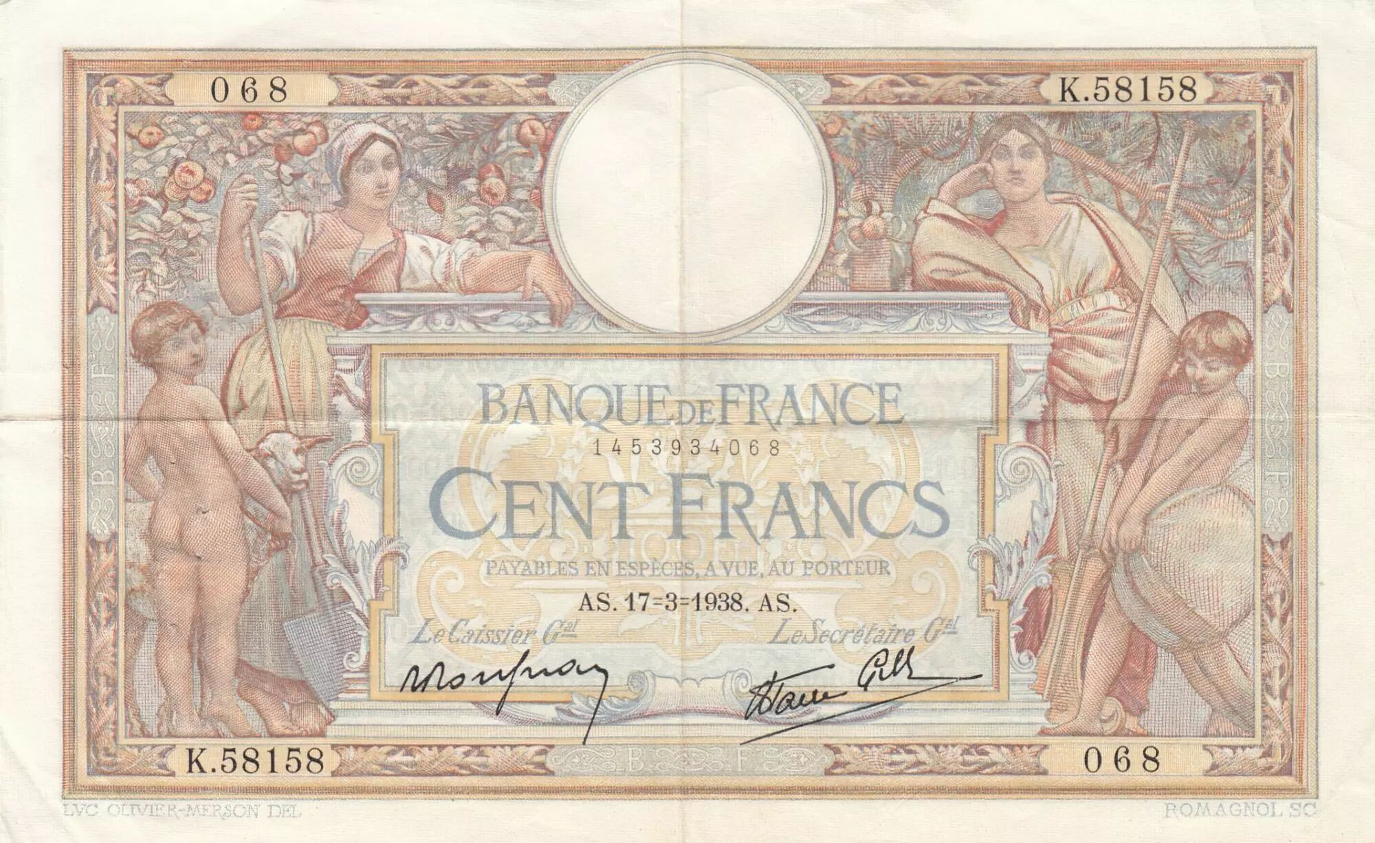 Billet France 100 Francs - Luc Olivier Merson - 17-03-1938 - Série K.58158