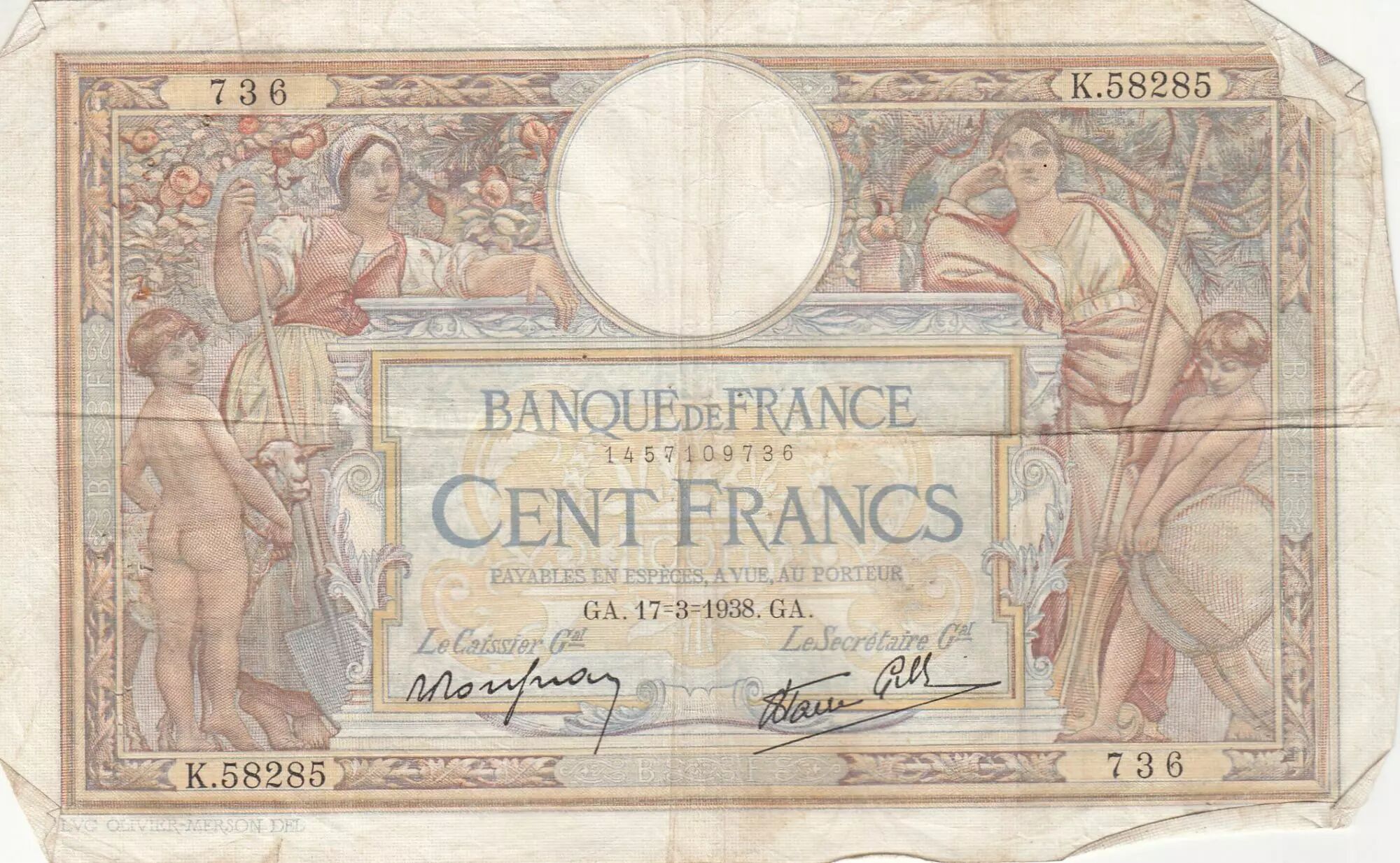 Billet France 100 Francs - Luc Olivier Merson - 17-03-1938 - Série K.58285