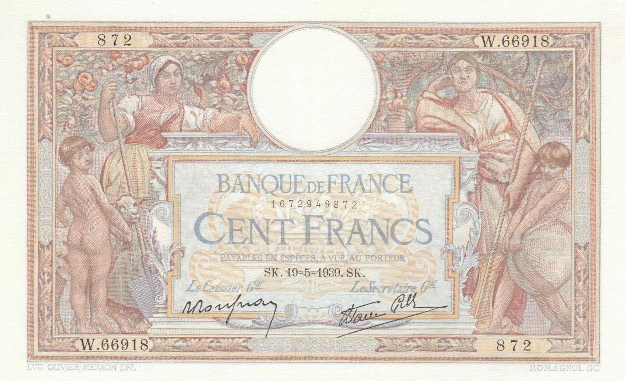 Billet France 100 Francs - Luc Olivier Merson - 19-05-1939 - Série W.66918