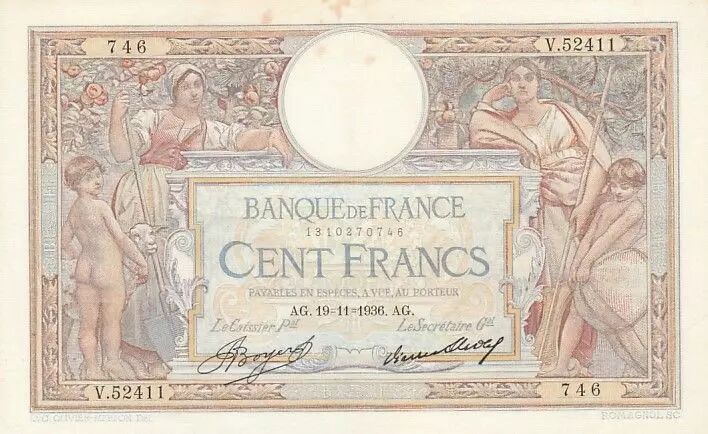 Banknote France 100 Francs Luc Olivier Merson - 19-11-1936 - Serial V.52411