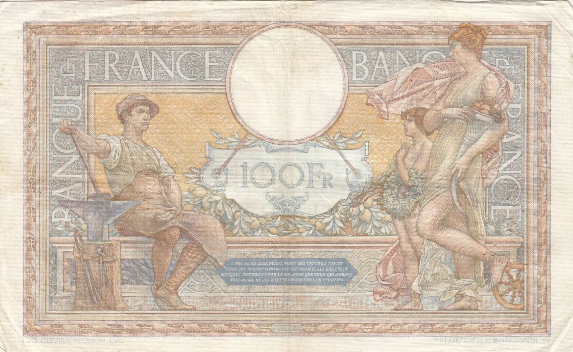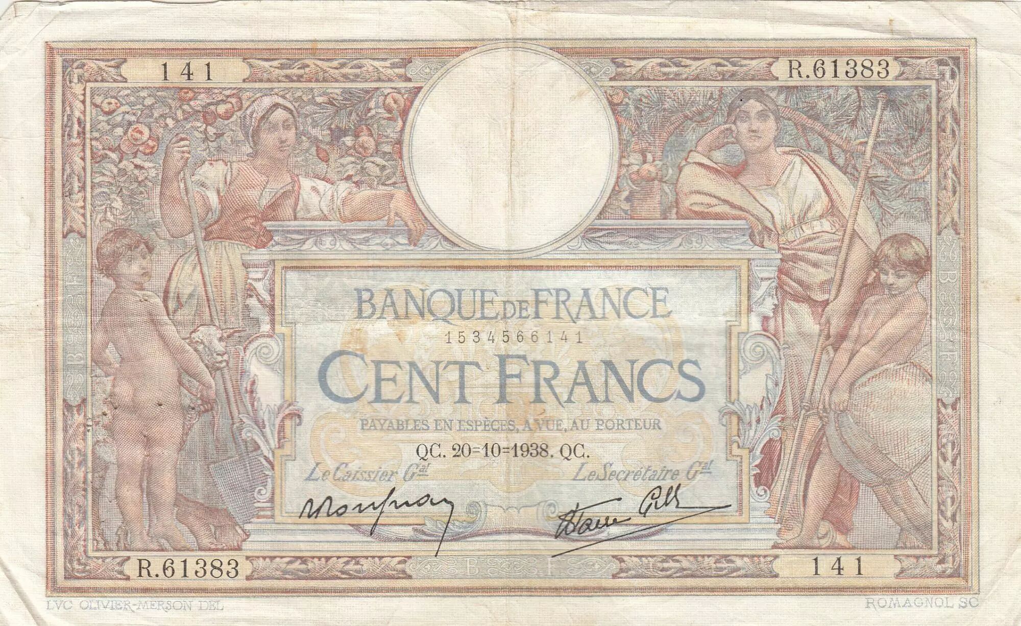 Banknote France 100 Francs - Luc Olivier Merson - 20-10-1938 - Serial R.61383