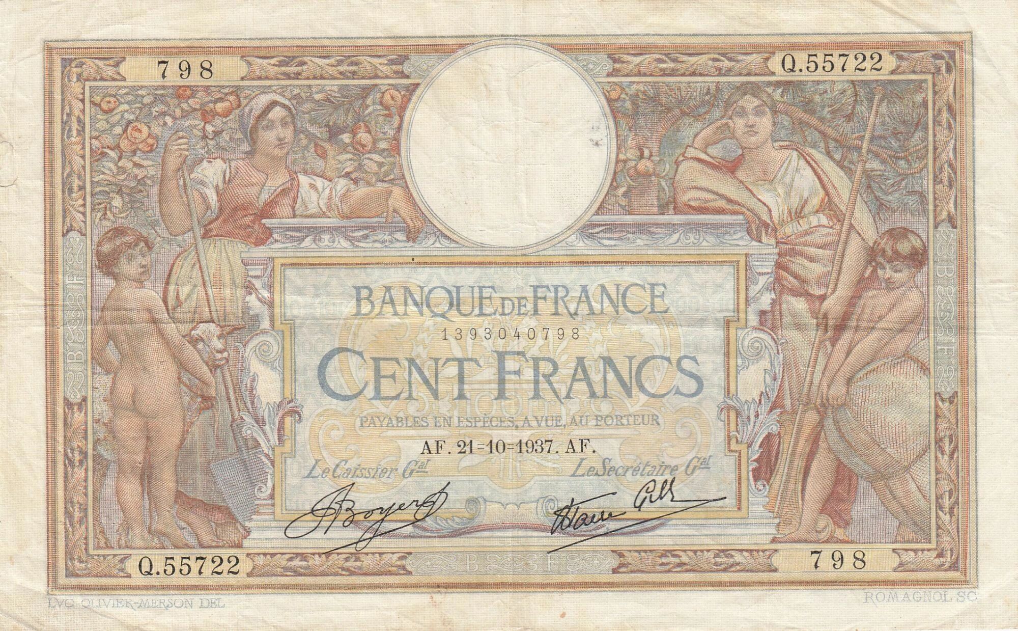 This French banknote has a face value of 100 francs. It was issued in France on October 21, 1937.