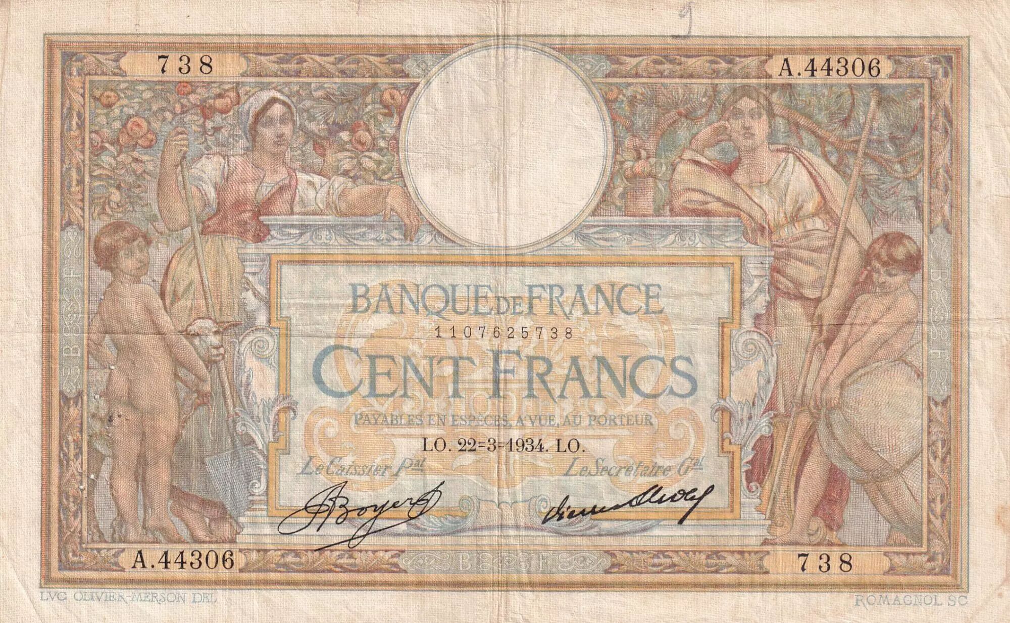 plis, épinglages, salissures, coupures, et tâches, billet comportant une trace d'écriture sur le devant