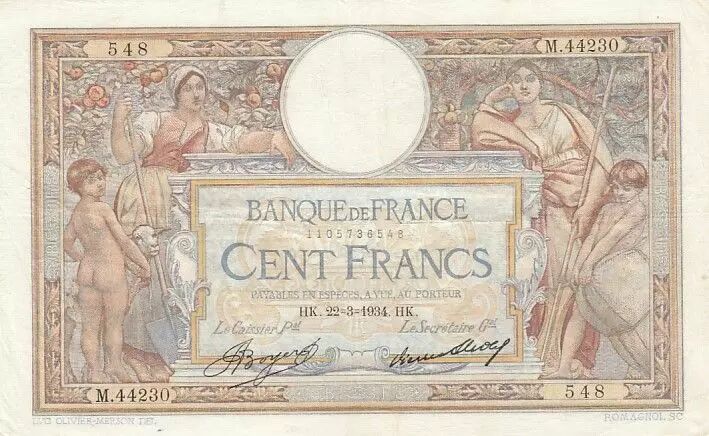 Accueil > Archivage > archivage-Billets Français > France 100 Francs - Luc Olivier Merson - 22-03-1934 - Série M.44230