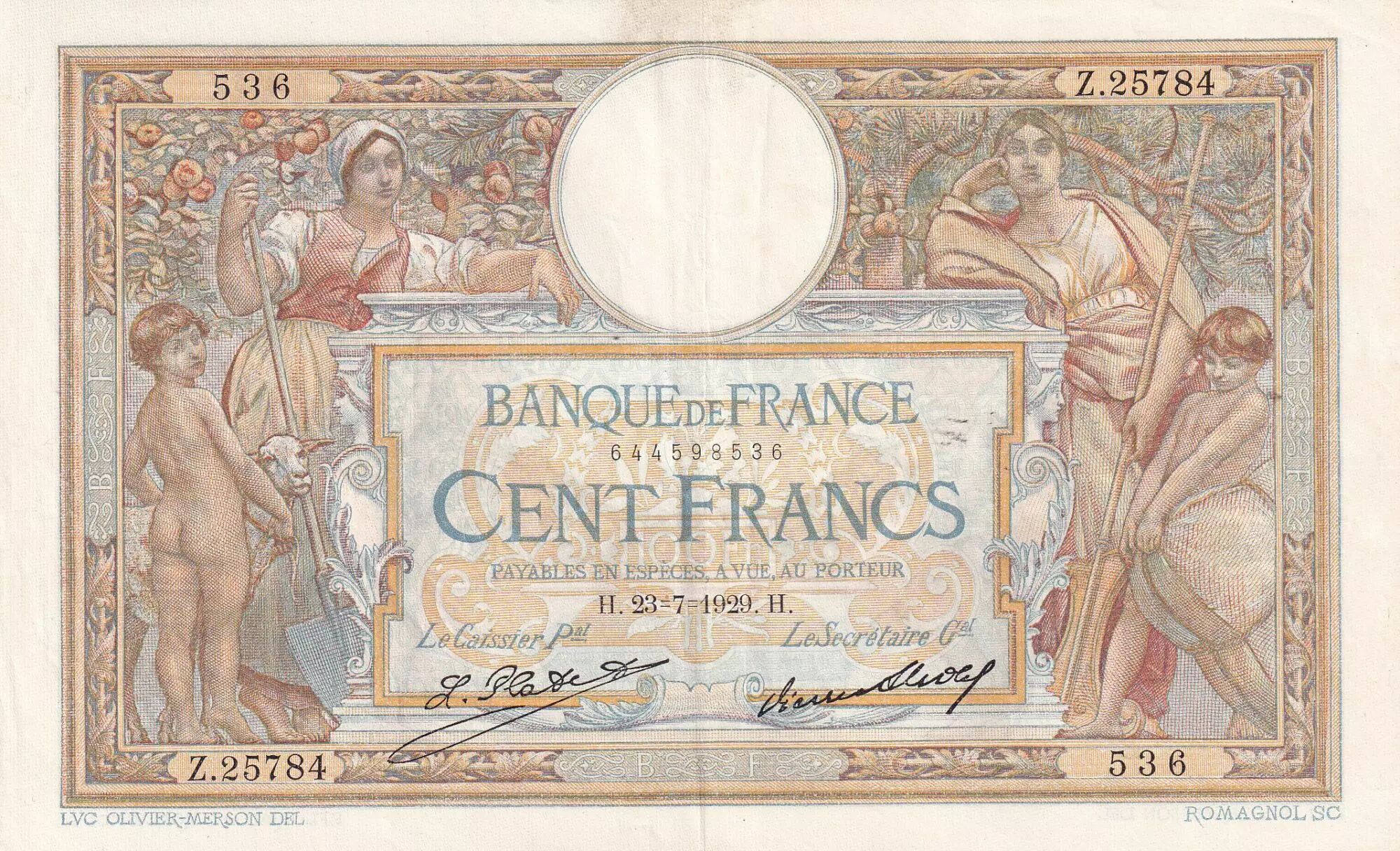 Home > French Banknotes > Bank of France Banknotes > 100 Francs Banknotes > Luc Olivier Merson Type 1906 (1908-1939) > France 100 Francs - Luc Olivier Merson - 23-07-1929 - Serial Z.25784 - P.69