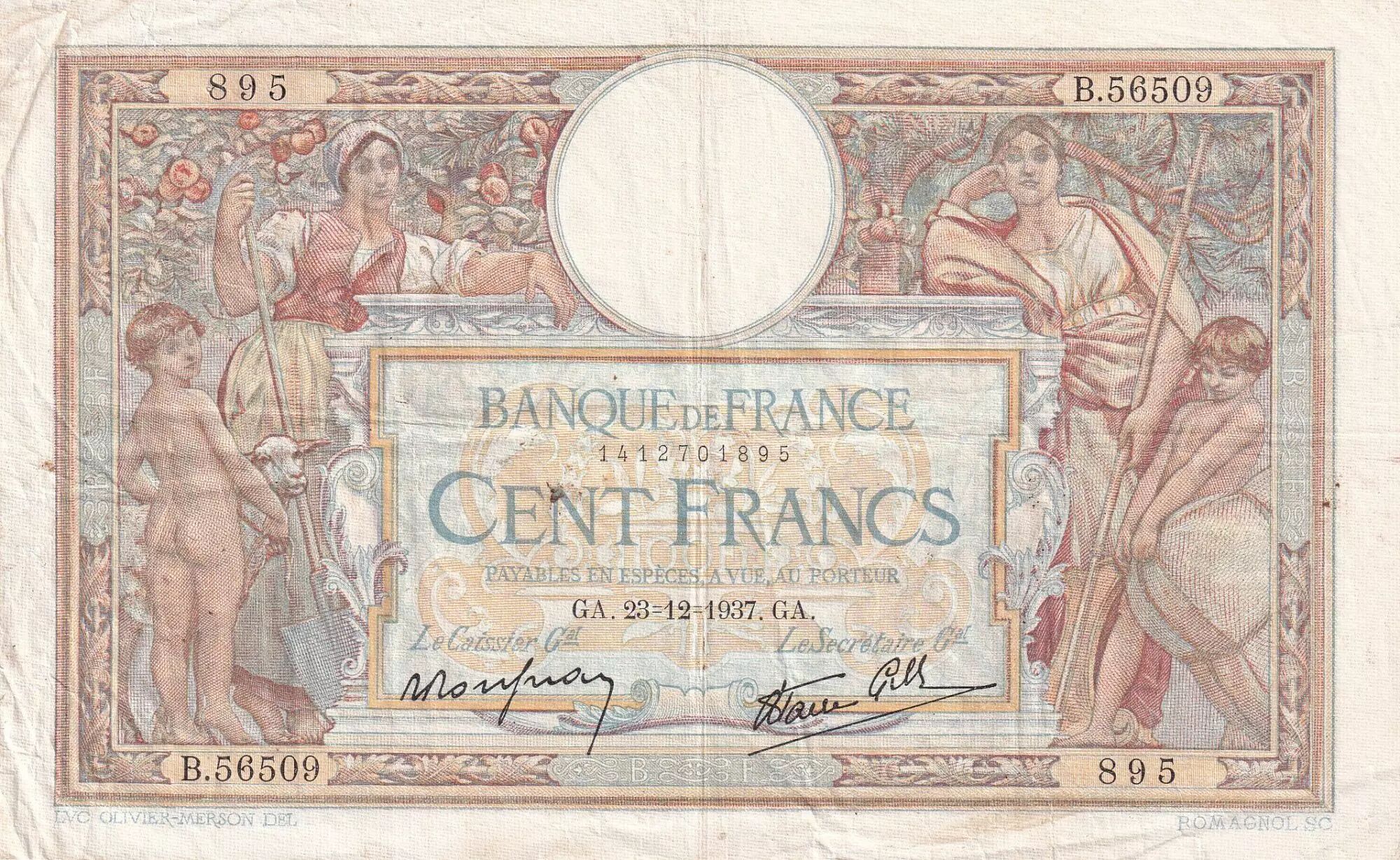 Banknote France 100 Francs Luc Olivier Merson - 23-12-1937 - Serial B.56509