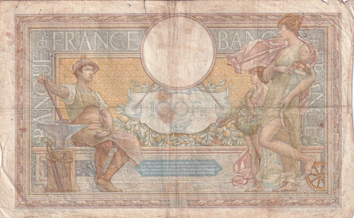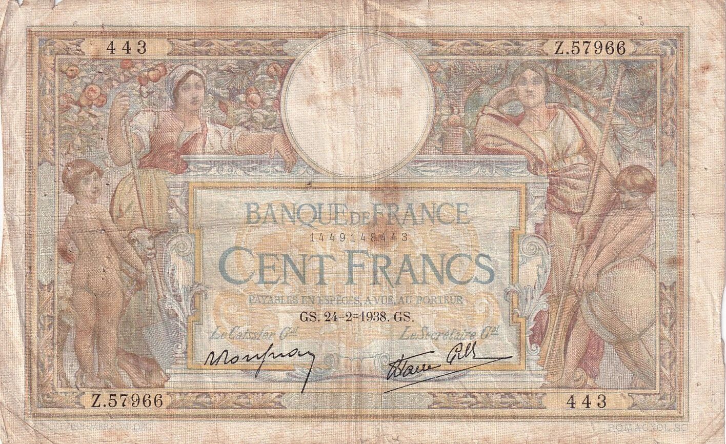 On the obverse, the banknote features allegorical personifications of Agriculture and Commerce, placed respectively to the right and left of the central motif. These figures are accompanied by two children, and the whole is embellished with representations of fruits and decorative plant elements. The perimeter of the banknote is adorned with golden moldings, adding to the overall aesthetics. The inscription "BANQUE DE FRANCE" is clearly visible, followed by the face value "CENT FRANCS" and the mention "PAYABLES EN ESPECES, A VUE, AU PORTEUR". The signature "LVC OLIVIER MERSON DEL ROMAGNOL SC" indicates the artists involved in its design.