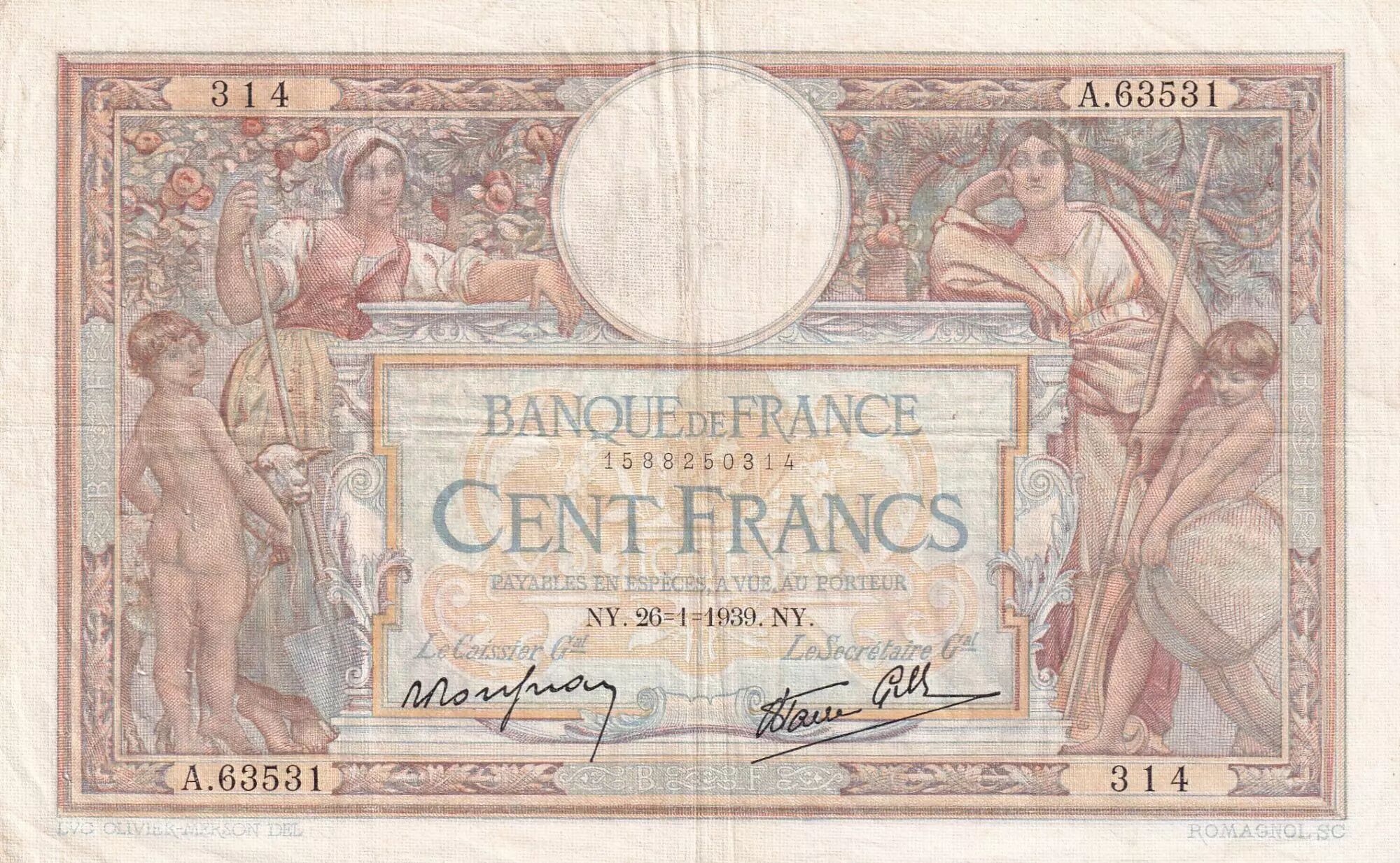 Accueil > Archivage > archivage-Billets Français > France 100 Francs - Luc Olivier Merson - 26-01-1939 - Série A.63531