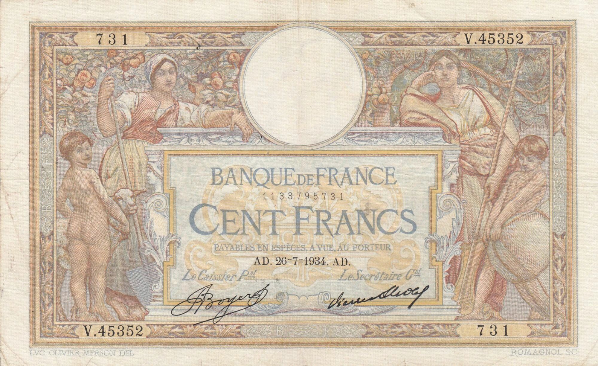 Ce billet de banque français a une valeur nominale de 100 francs. Il a été émis en 1934.
