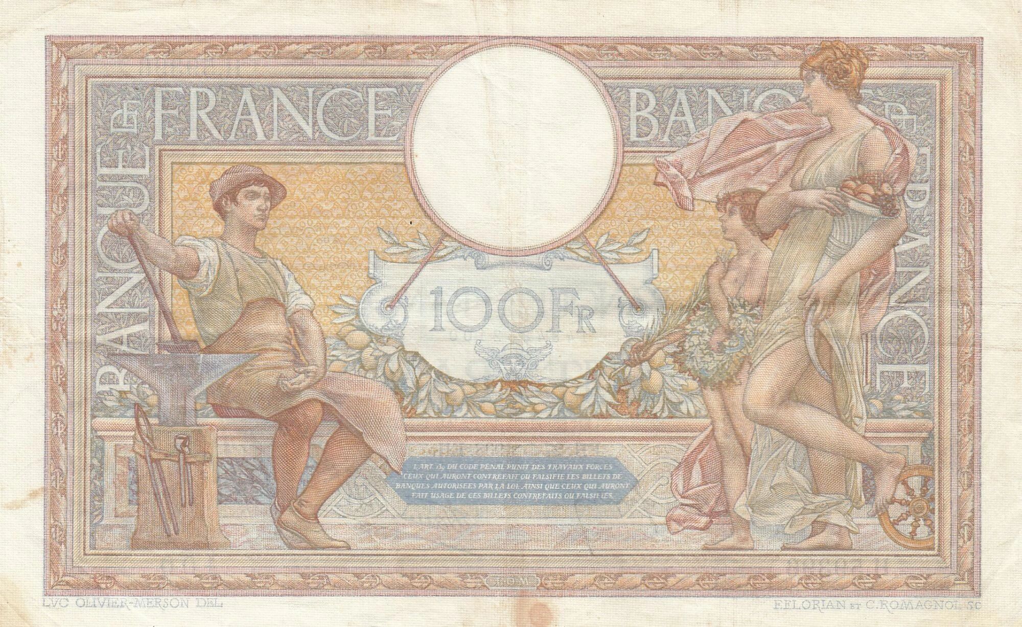 La valeur nominale du billet est de 100 francs. L'unité monétaire est donc le franc, qui était la monnaie officielle de la France à cette époque. Il est important de noter que la valeur réelle de ce billet, en tant qu'objet de collection, peut différer considérablement de sa valeur nominale d'origine. Elle est influencée par divers facteurs tels que sa rareté, son état de conservation et la demande sur le marché des collectionneurs.