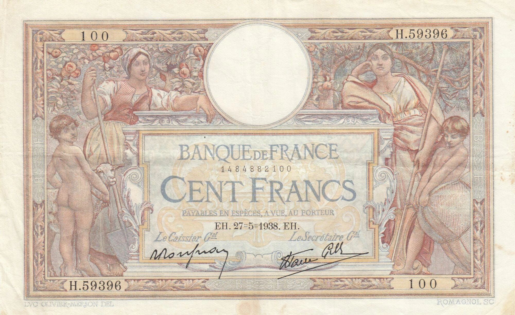 This banknote is a 100 Francs, issued in France. It is named after Luc Olivier Merson and was put into circulation on May 27, 1938. The serial number of this specific banknote is H.59396.
