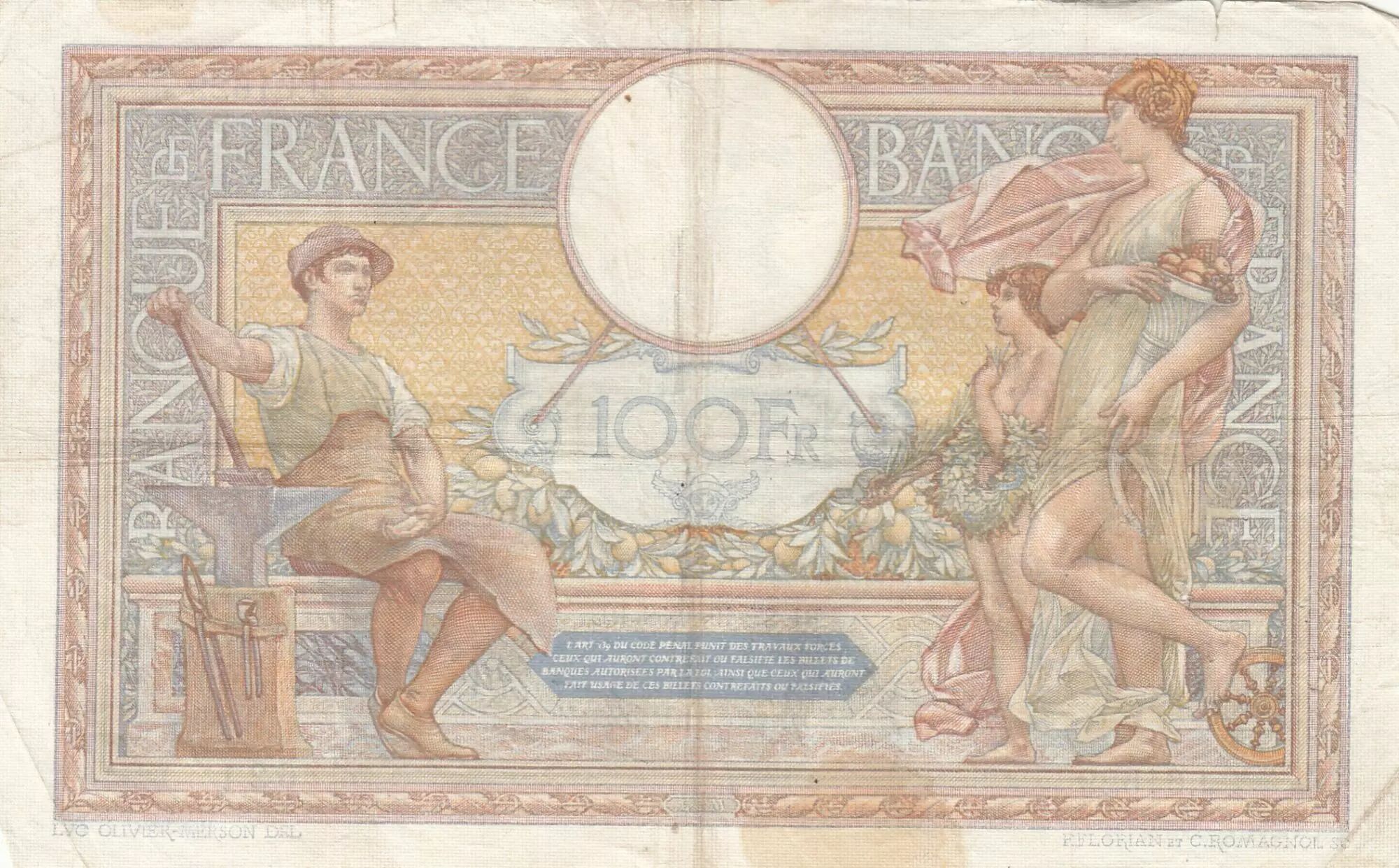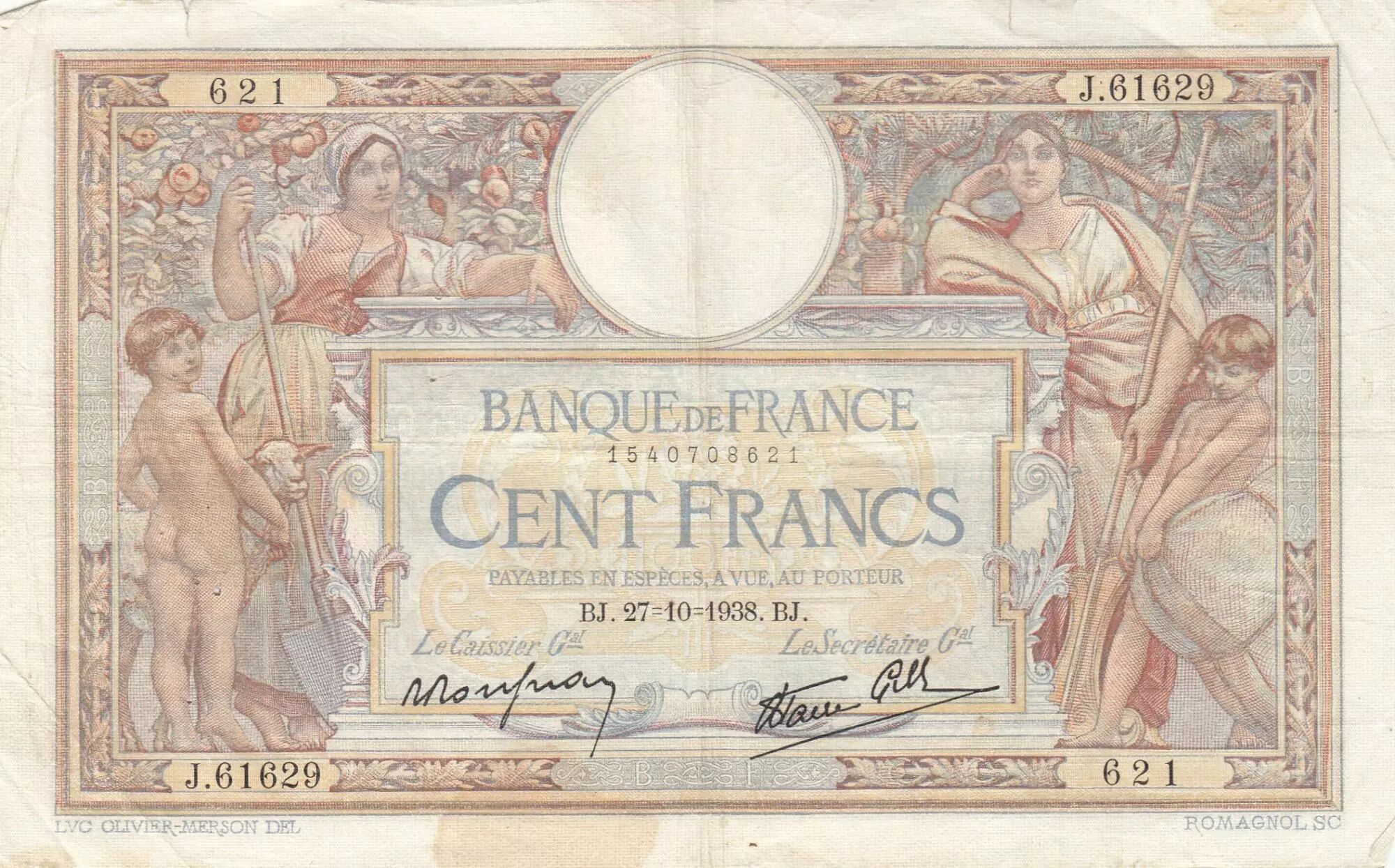 Banknote France 100 Francs - Luc Olivier Merson - 27-10-1938 - Serial J.61629