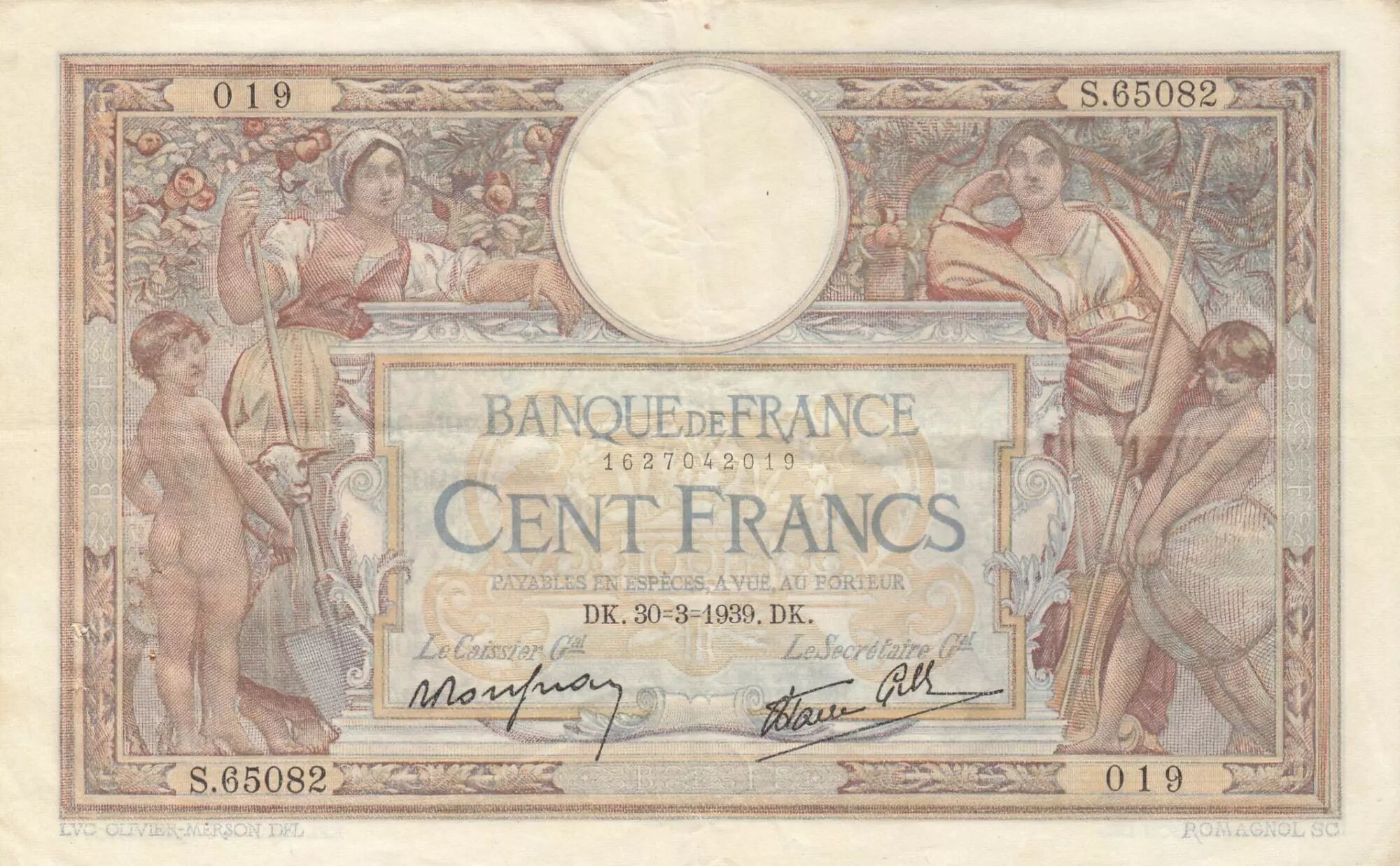Banknote France 100 Francs - Luc Olivier Merson - 30-03-1939 - Serial S.65082