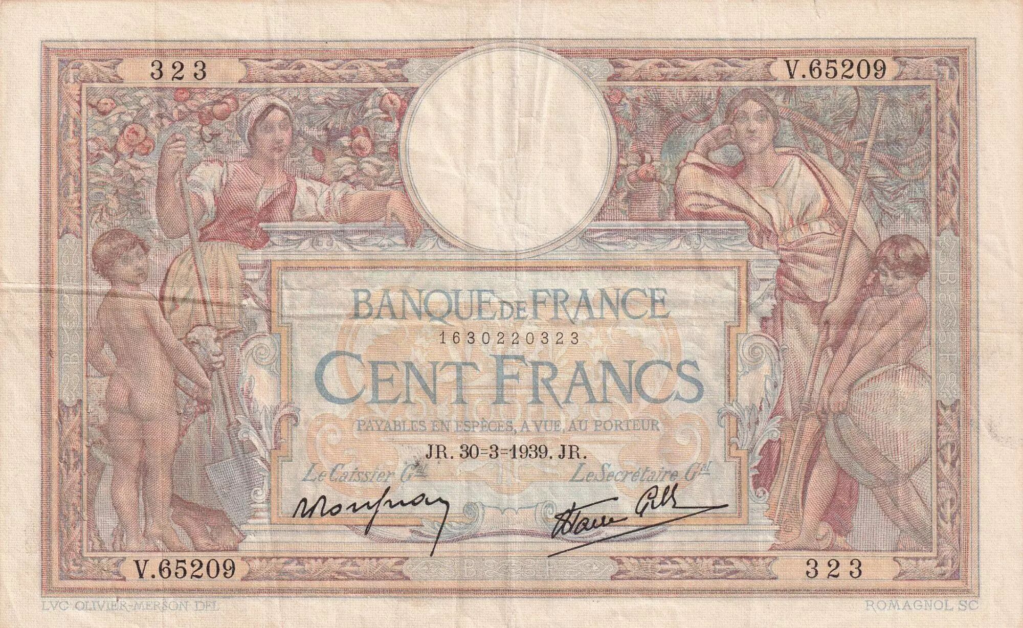 Banknote France 100 Francs Luc Olivier Merson - 30-03-1939 - Serial V.65209