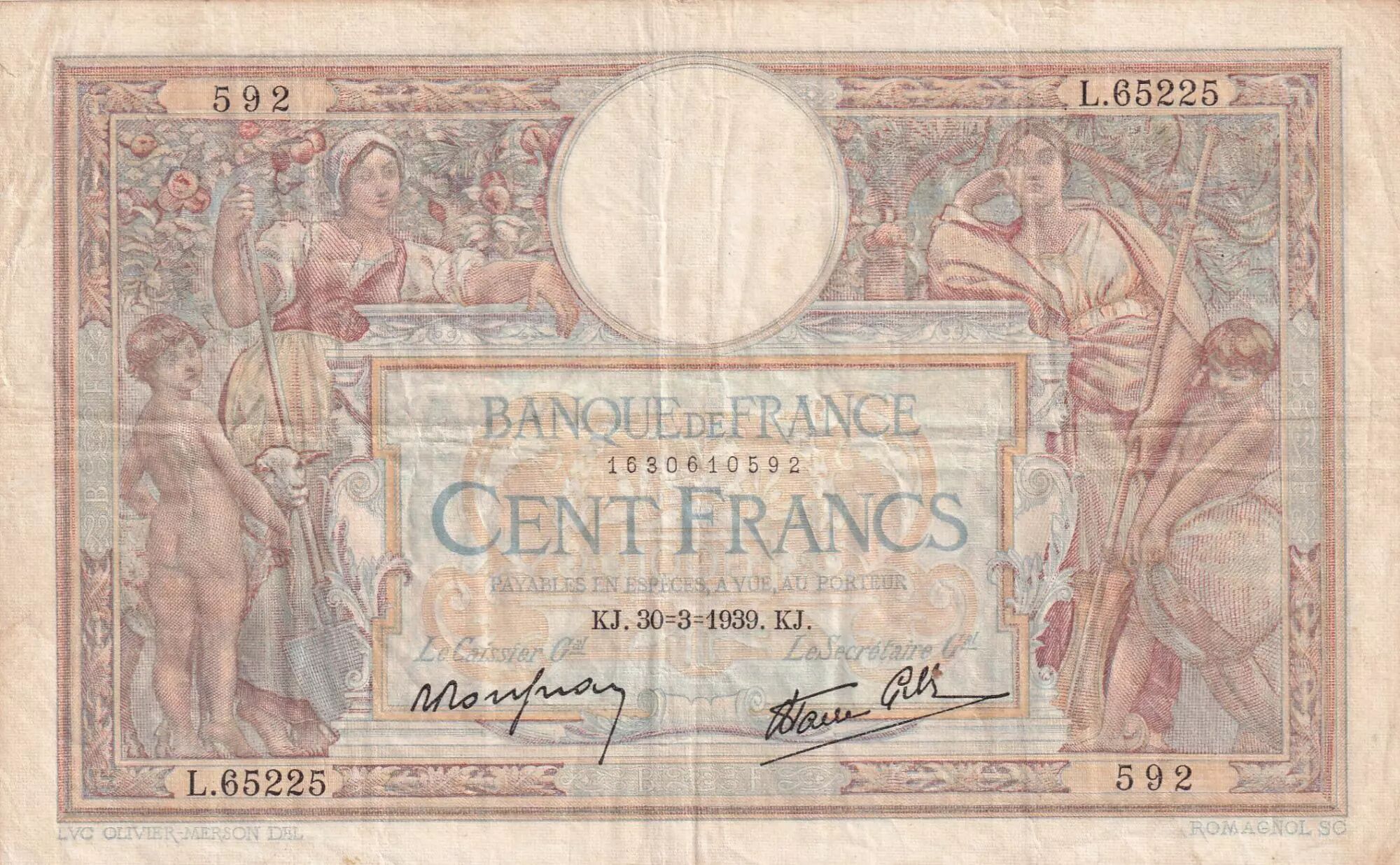 Billet France 100 Francs - Luc Olivier Merson - 30-03-1939 - Série L.65225