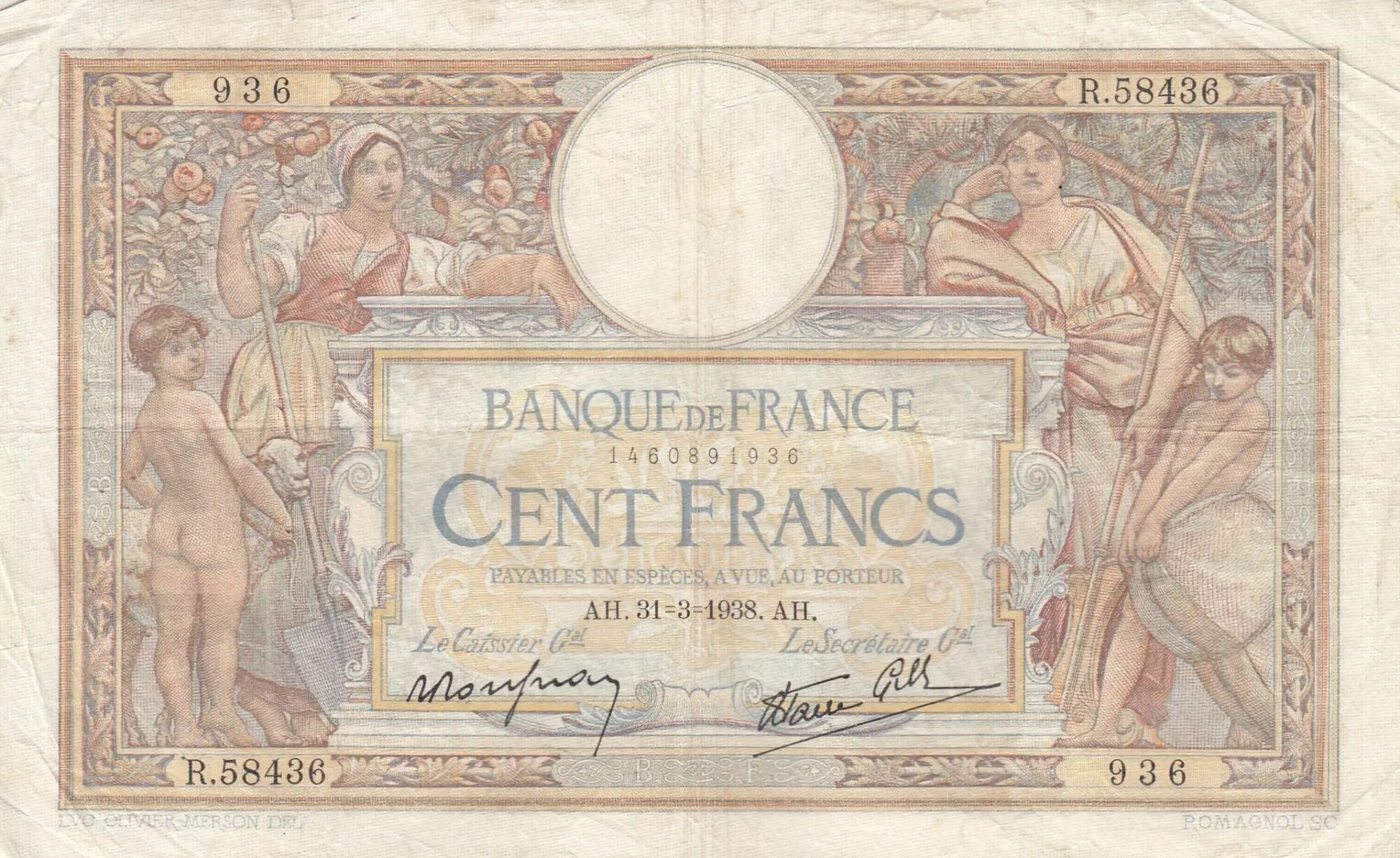 Banknote France 100 Francs Luc Olivier Merson - 31-03-1938 - Serial R.58436