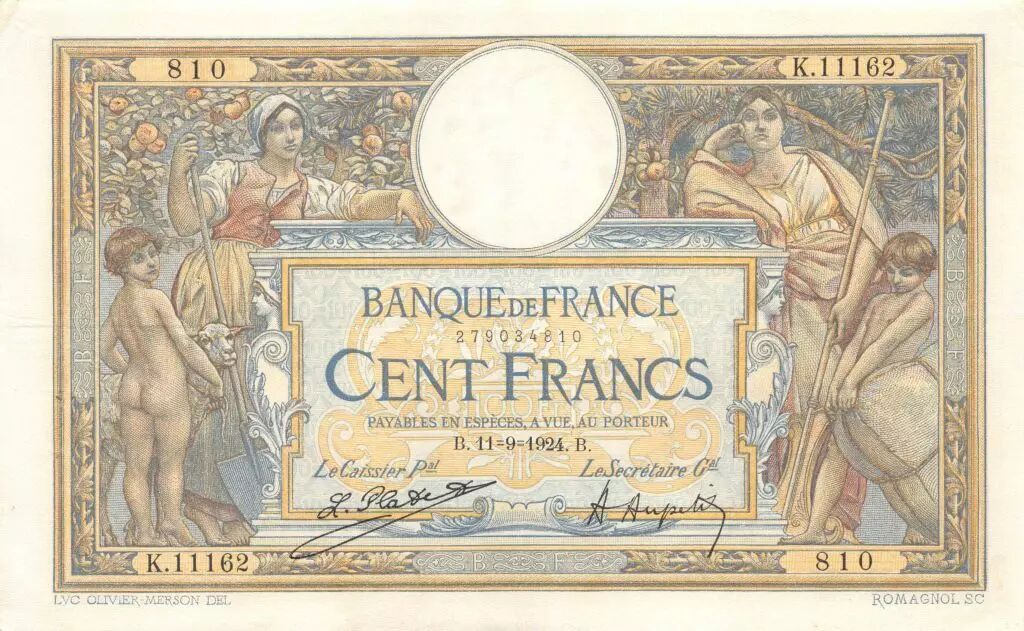 Accueil > Archivage > France 100 Francs Luc Olivier Merson - Grands Cartouches - 11-09-1924 Série K.11162 - SUP