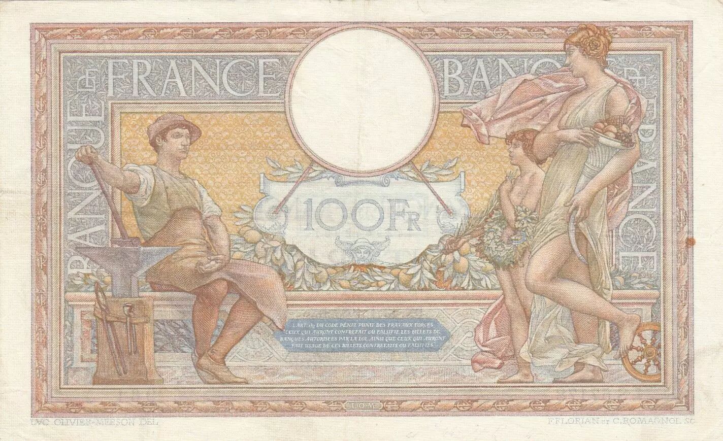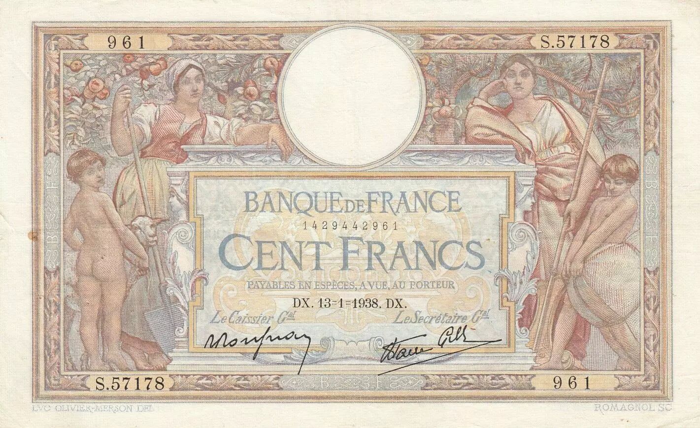 Accueil > Billets Français > Billets Banque de France > Billets 100 Francs > Luc Oliver Merson type 1906 (1908-1939) > France 100 Francs Luc Olivier Merson - Grands Cartouches - 13-01-1938 - Série S.57178
