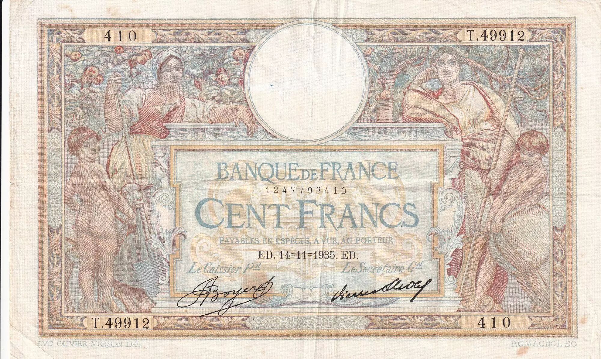 Accueil > Archivage > France 100 Francs Luc Olivier Merson - Grands Cartouches - 14-11-1935 - Série T.49912