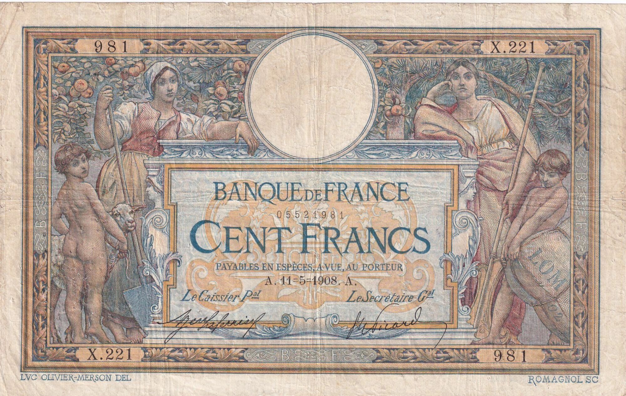 The 100 Francs Luc Olivier Merson banknote, dated May 11, 1908, from the X.221 series, is a testament to the art and economy of France during that era.