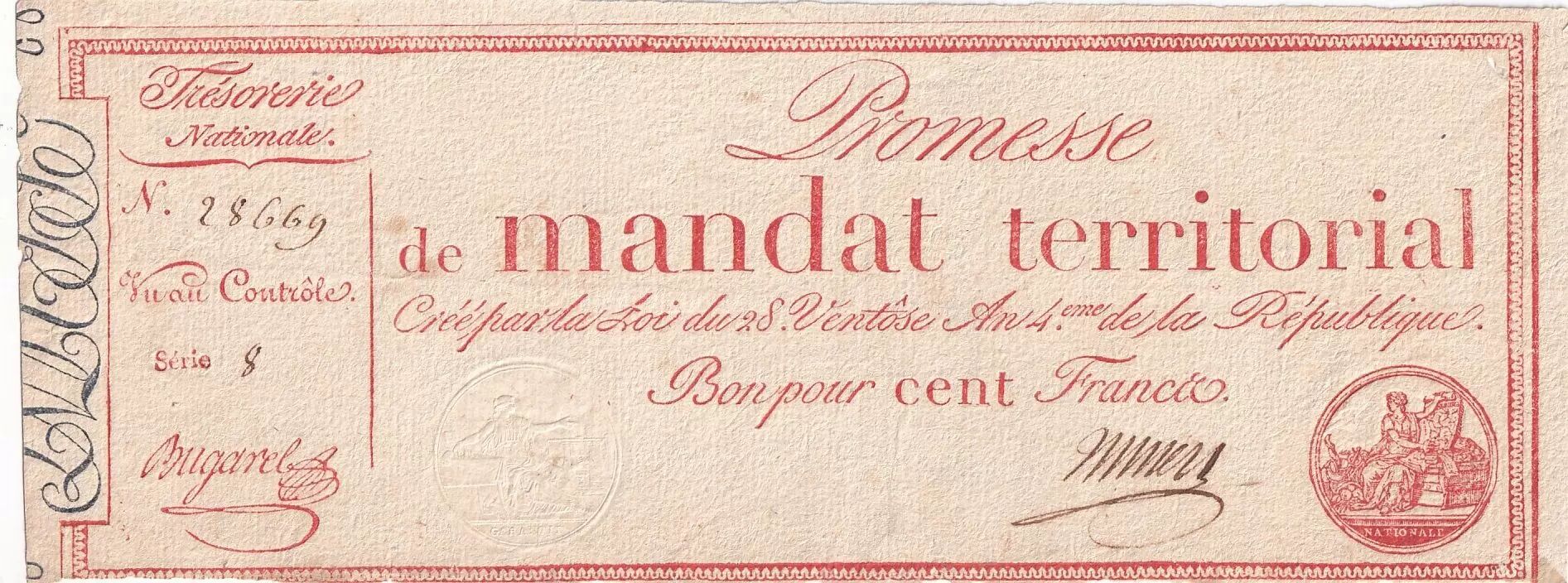 Accueil > Archivage > archivage-Billets Français > France 100 Francs - Mandat Territorial - 1796 - Série 8 - L.197