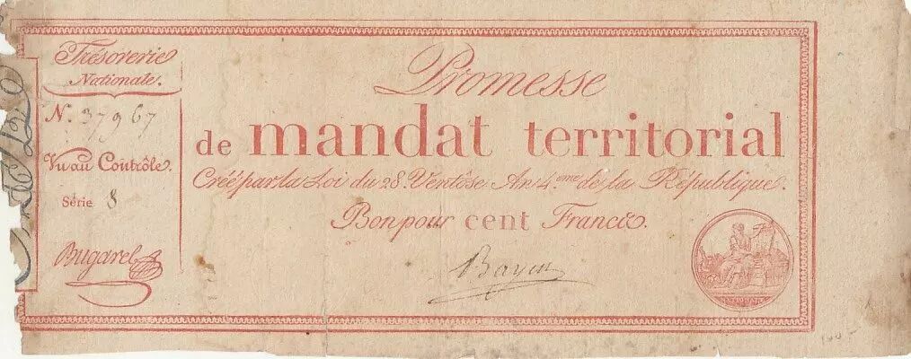 Banknote France 100 Francs - Mandate Territorial - 1796 - Serial 8
