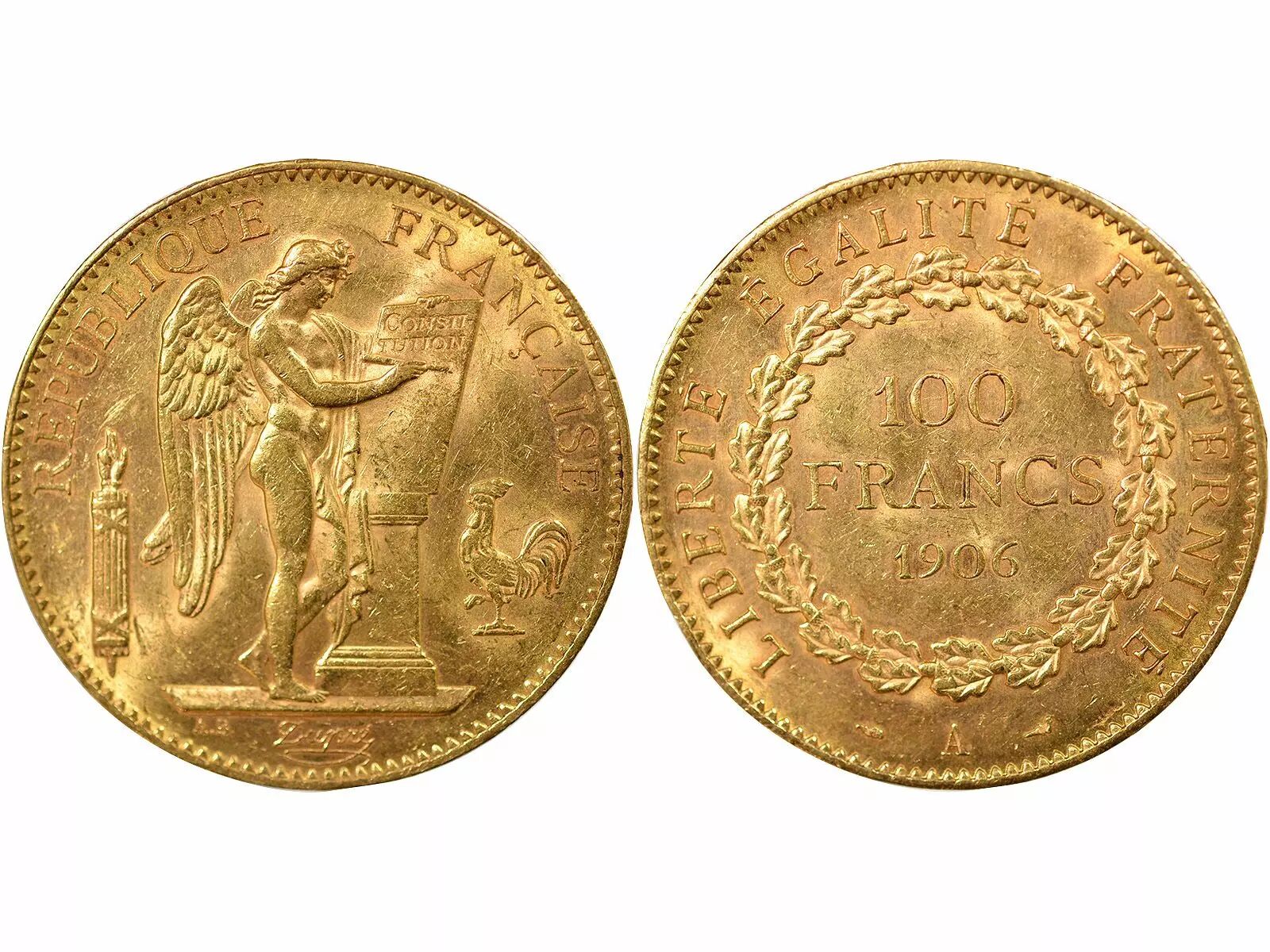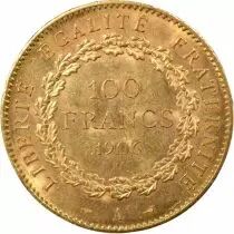 Cette pièce est une pièce de monnaie française d'une valeur nominale de 100 francs. Elle est frappée en or et a été produite à l'atelier de Paris, identifié par la lettre "A". L'année d'émission est 1906.