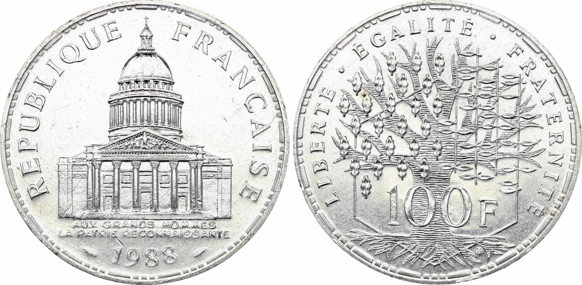 La pièce de 100 Francs Panthéon, frappée en 1988, est une pièce commémorative émise par la France. Elle est fabriquée en argent avec un titrage de 900 millièmes, ce qui signifie qu'elle est composée de 90% d'argent pur et de 10% d'autres métaux pour augmenter sa durabilité.
