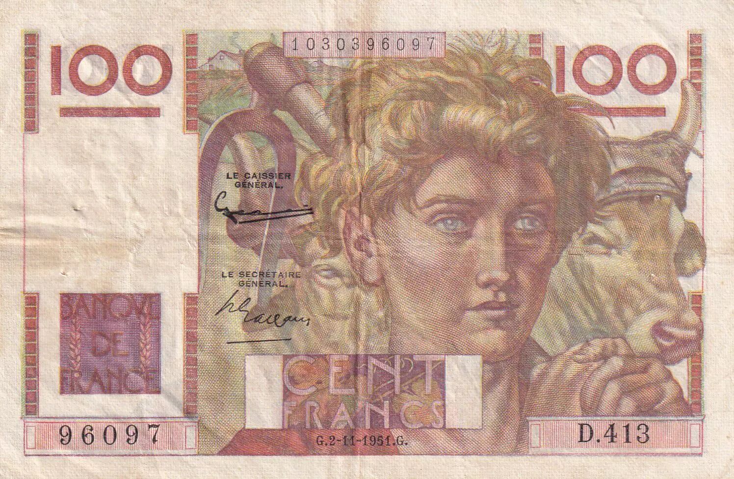 Billet France 100 Francs Paysan - 02-11-1951 - Série D.413 - TTB