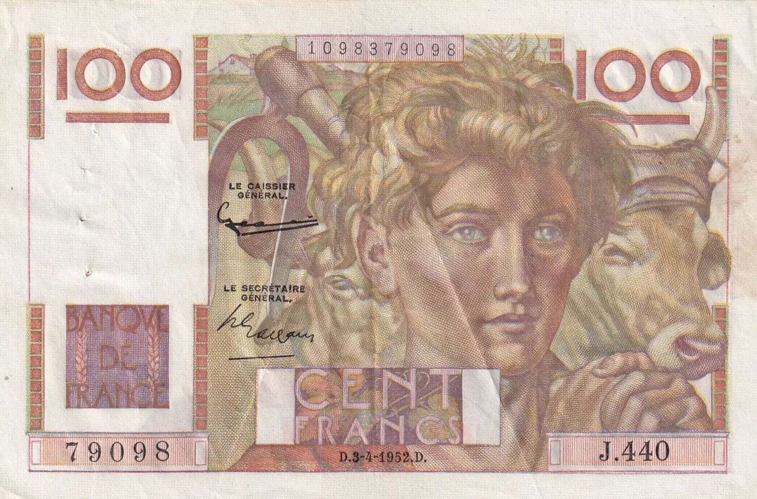 Accueil > Archivage > France 100 Francs Paysan - 03-04-1952 - Série J.440