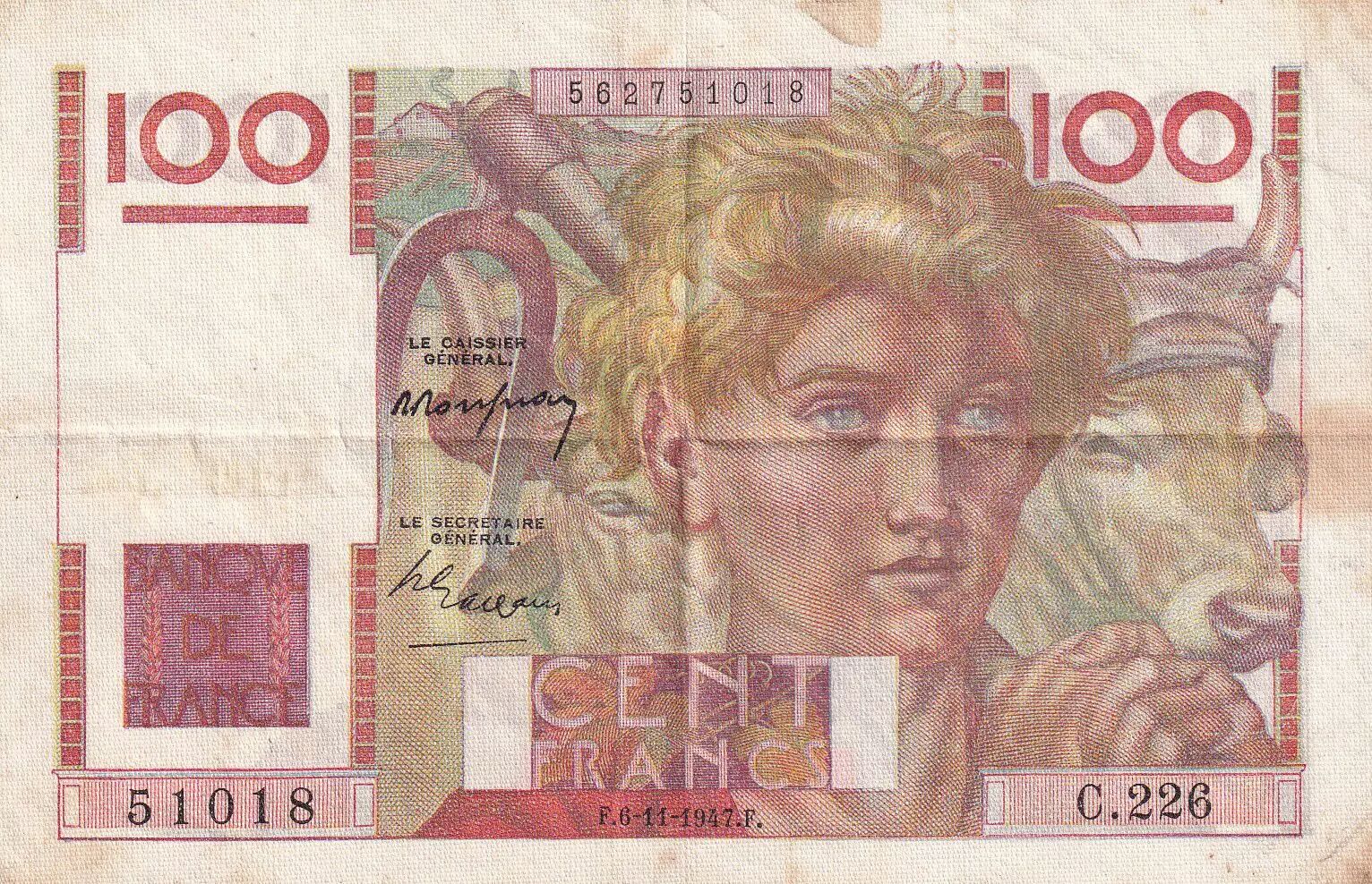 Accueil > Archivage > France 100 Francs Paysan - 06-11-1947 - Série C.226 - TTB