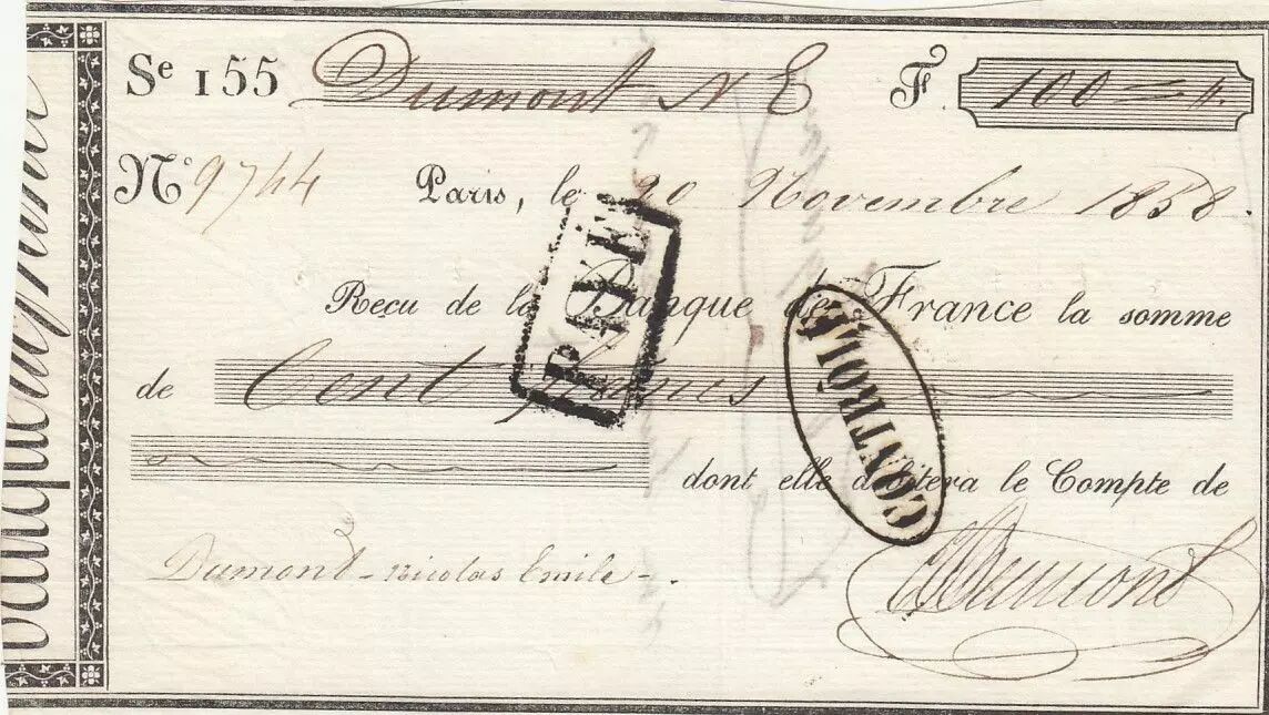Billet France 100 francs - Reçu banque de France - Série 155 - 1858