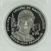 The obverse of the coin features a front-facing portrait of Marshal Leclerc, with Strasbourg Cathedral in the background. An escutcheon representing France with the Cross of Lorraine is also visible. The inscriptions "PHILIPPE LECLERC DE HAUTECLOCQUE", "2e DB" and "REPUBLIQUE FRANÇAISE" surround the portrait. The engraving is signed Émile Rousseau.