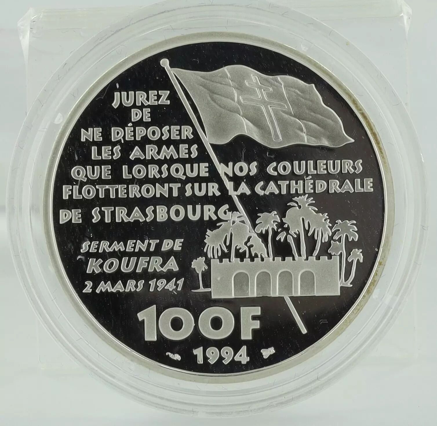 The reverse of the coin illustrates a surrounding wall with palm trees in the background, as well as the French flag adorned with the Cross of Lorraine. The inscription "JUREZ DE NE DÉPOSER LES ARMES QUE LORSQUE NOS COULEURS FLOTTERONT SUR LA CATHÉDRALE DE STRASBOURG" recalls the Koufra oath, pronounced on March 2, 1941. The words "SERMENT DE KOUFRA", the face value "100F" and the year of issue "1994" are also found there.