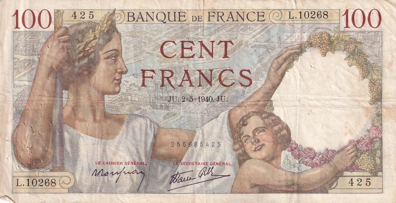 Ce billet de banque français d'une valeur nominale de 100 francs a été émis le 2 mai 1940. Il appartient à la série L.10268.