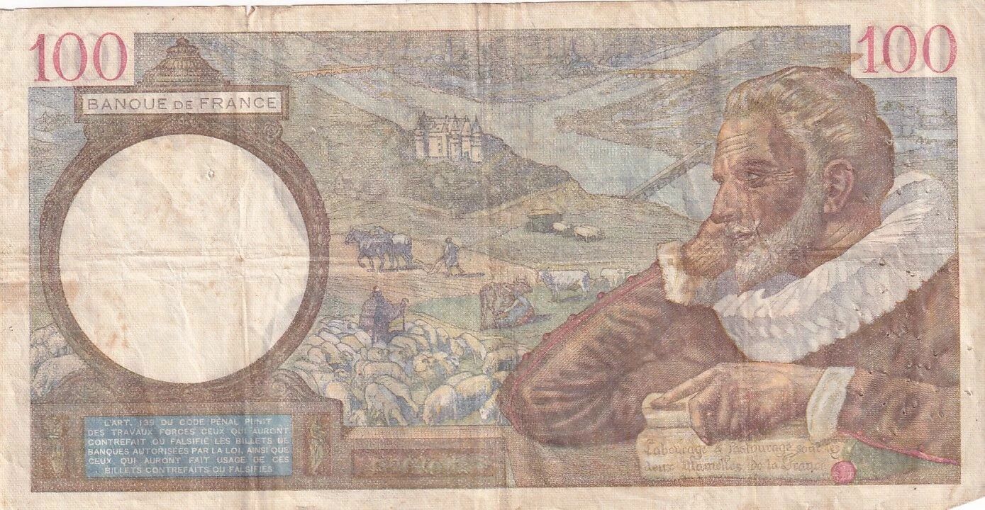 Le verso du billet met en scène Sully, représenté sur la droite tenant un parchemin. Le fond est composé d'un paysage champêtre pittoresque, évoquant des pâturages. Les dimensions de ce billet sont de 180 mm de longueur et 92 mm de largeur. Son poids est d'un gramme.