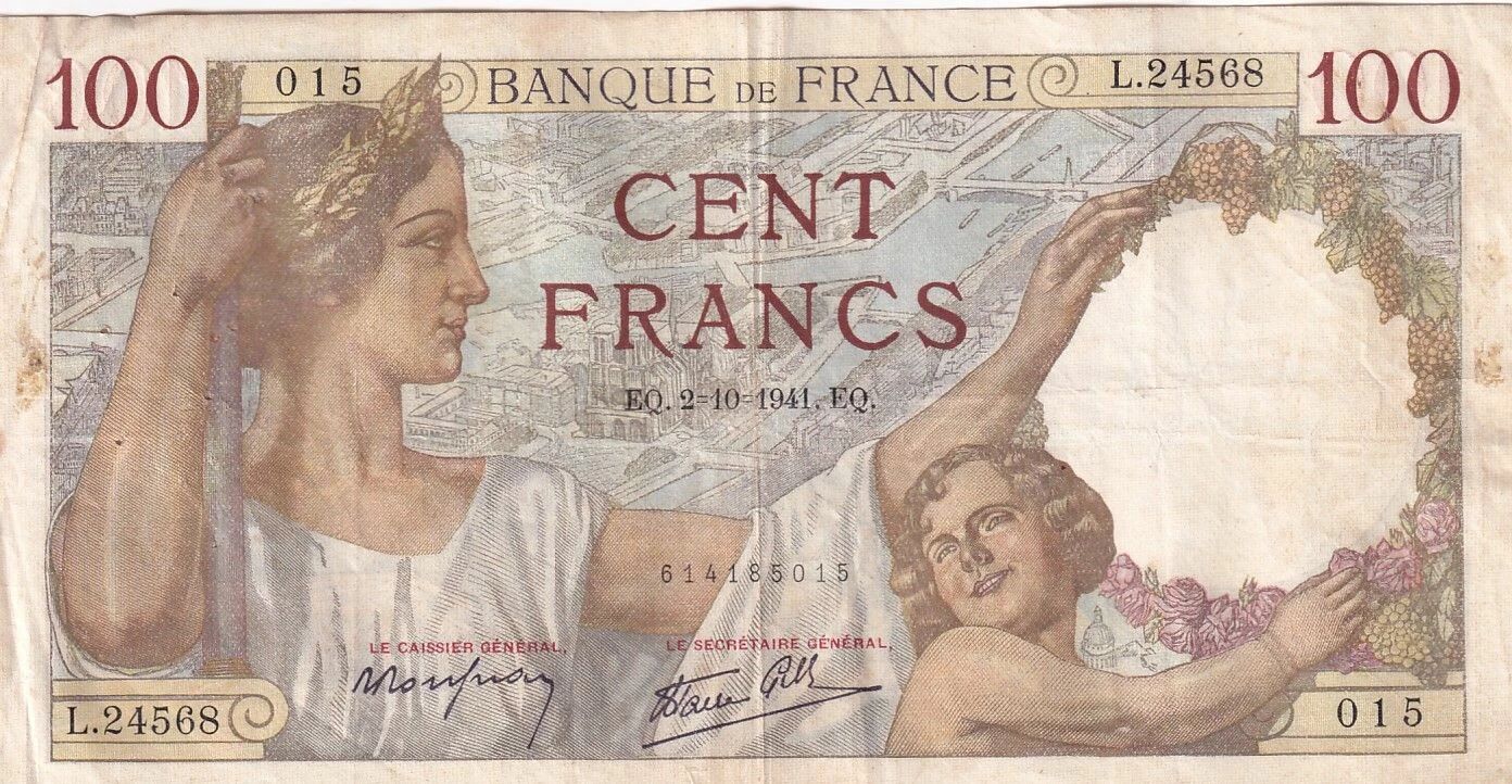 On the front, we observe a bust of a laureate woman, an allegory of France, who holds the baton of command in her right hand. With her left hand, she picks fruits and flowers, which are offered to her by a child, symbolizing Youth. The background reveals an aerial view of Paris, where Notre-Dame Cathedral and the Seine winding through the city can be recognized. The inscriptions "100 BANQUE DE FRANCE 100" and "CENT FRANCS" are present in capital letters. The script used is Latin. Ernest Deloche is the engraver of this side, while Lucien Hector Jonas is the designer.